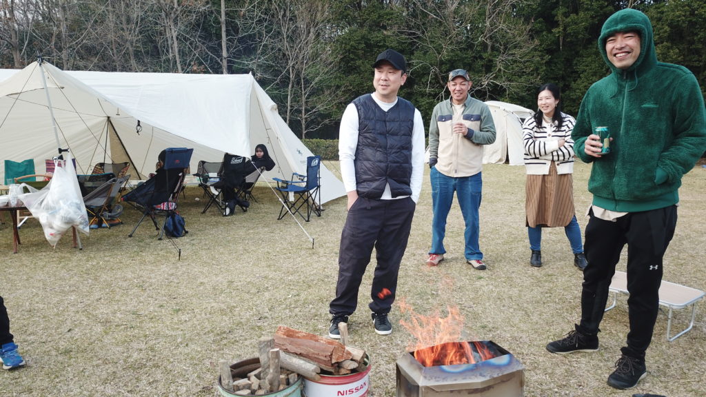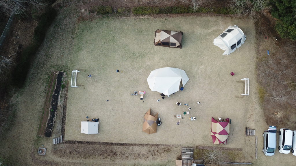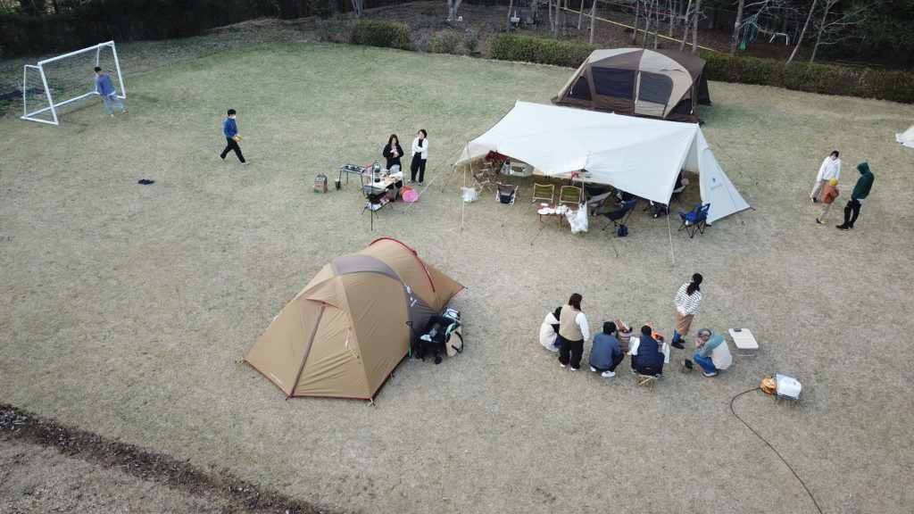 自由広場で多少の球技ができるスペースを確保しつつ、中央に大きなタープ、その周辺に宿泊用テントを上手に配置されていました。夕方、楽しそうな様子を少しドローンで撮影させていただきました。