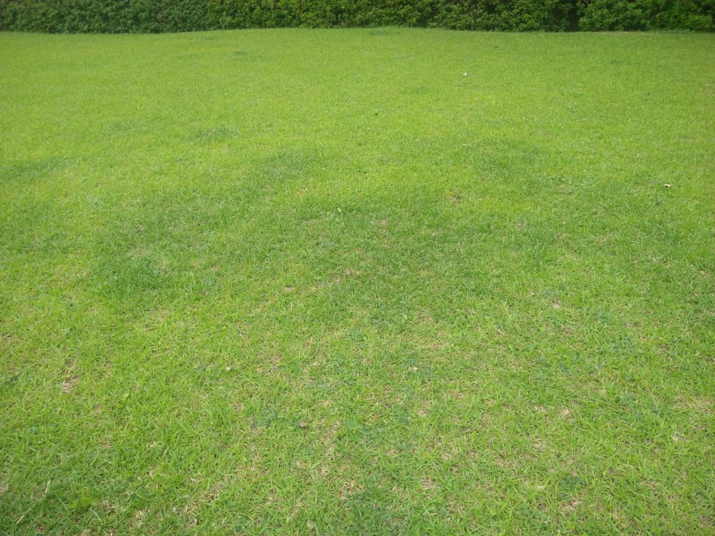 上の写真で肥料をまいたところは濃い緑に、まいていないところはもえぎ色になっています。こうしたムラは主に窒素分の影響で、水田などでも見られることがあります。