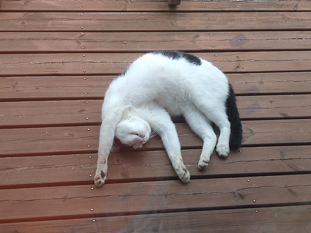 最後に愛猫のすばるです。猛暑の日にはこんな格好で休んでいたりします。暑くても外で過ごしたがることが多いのですが、遠くへはいかずに家の陰で休んでいることが多いようです。