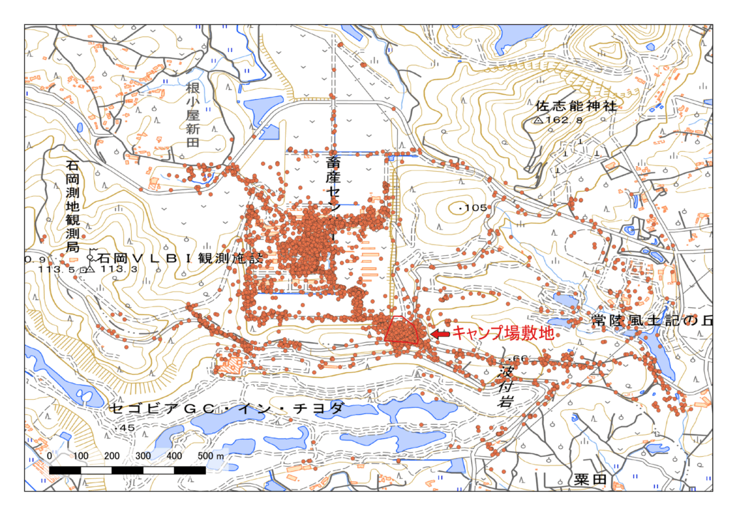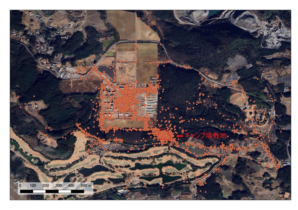 下の図はすばるの位置情報を国土地理院地図に重ねたものです。キャンプ場の敷地内を中心として東西約2km、南北約1.5kmの範囲まで出かけています。また、キャンプ場の北西側に隣接している県の畜産センターに頻繁に滞在していることがわかりました。これまでもフェンスを越えていくところは何回か目撃していましたが、予想以上にお気に入りのようです。牛舎周りなどではネズミがよく出るからかもしれません。